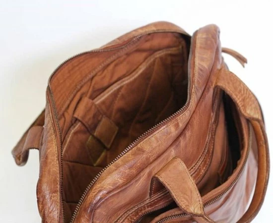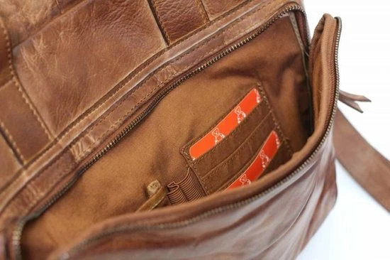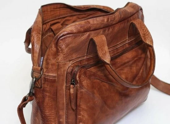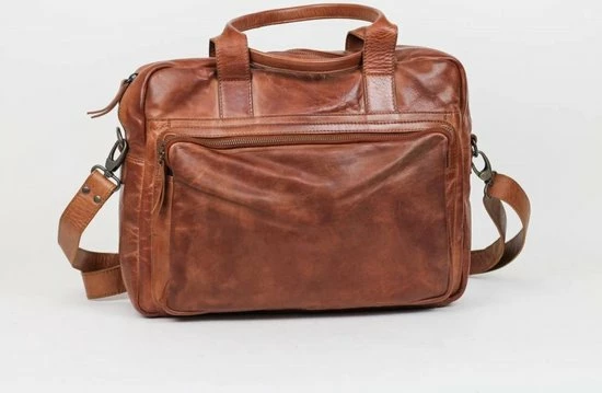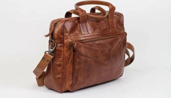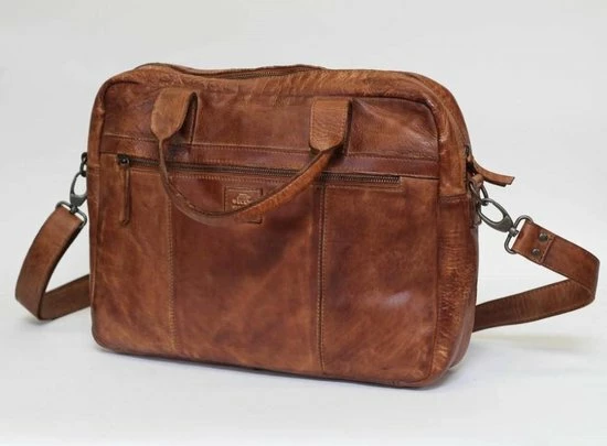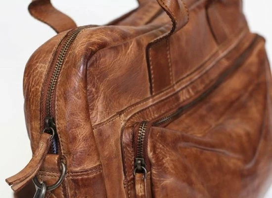 Mooie, leren laptoptas uit de Cow Lavato serie van Bear Design. De tas is vervaardigd van rundleer met een karaktervolle stoere uitstraling. De tas heeft een hoofdvak met ritssluiting waar A4-formaat documenten in passen. In het hoofdvak zitten 2 steekvakken, 2 ritsvakken en een laptopvak (35 x 24 cm) voor een 14 inch laptop. Op de voorzijde van de tas zit een ritsvak met daarin een organizer voor het overzichtelijk opbergen van visitekaartjes, schrijfwaren en andere accessoires. Op de achterzijde van de tas zit een groot ritsvak. De tas kan in de hand gedragen worden met de twee stevige handvatten maar ook over de schouder door gebruik te maken van de meegeleverde afneembare lange, verstelbare schouderband.