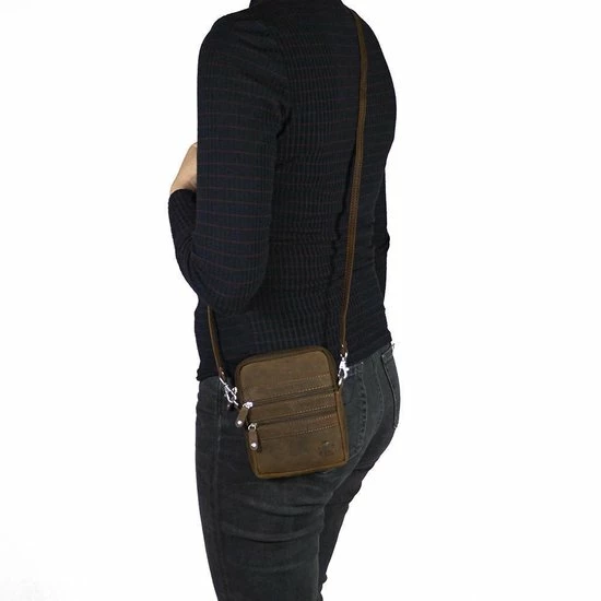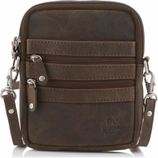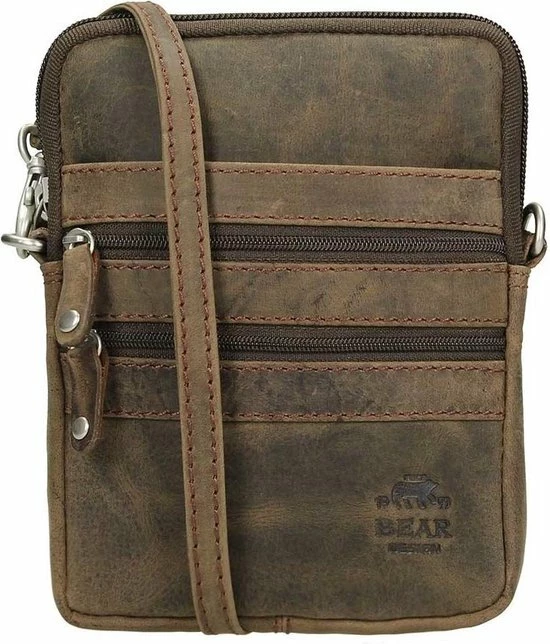 Trendy kleine leren crossbodytas / schoudertas uit de Dark Nature serie van Bear Design. De tas heeft een hoofdvak dat afsluitbaar is middels een ritssluiting met binnenin een insteekvak. Op de voorzijde van het tasje zitten 2 ritsvakjes. Op de achterzijde zit een lus waar een broekriem doorheen past. Dit tasje kun je dus ook als riemtasje gebruiken door hem aan je eigen broekriem te bevestigen. Met de afneembare, verstelbare lange schouderband kun je het tasje op de door jou gewenste lengte over de schouder of schuin over het lichaam (crossbody) dragen.