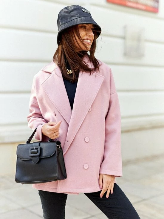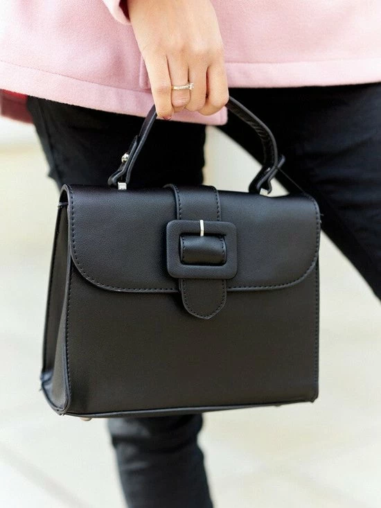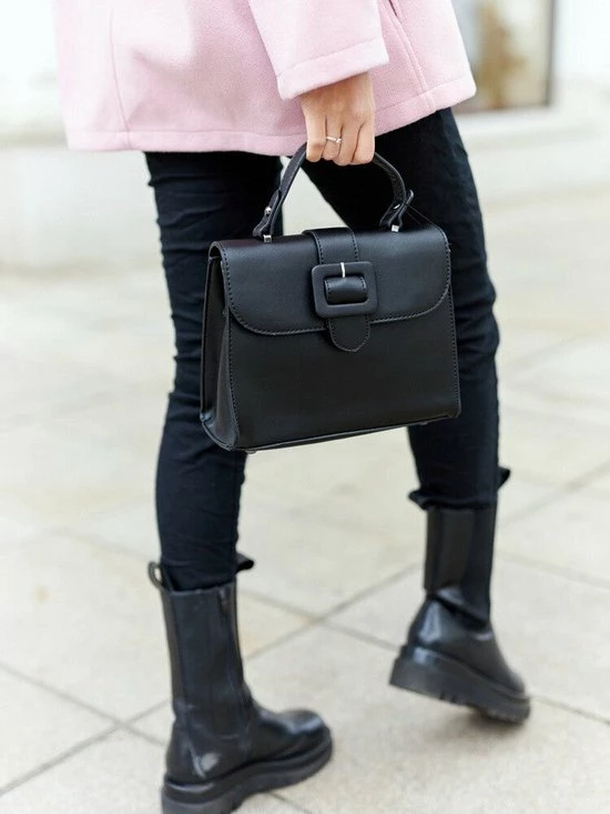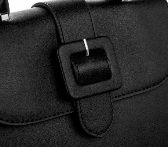 Trapeziumvormige dames koffer. Afgesloten met een klep met een imitatie van een gesp waaronder magnetische clips worden geplaatst.