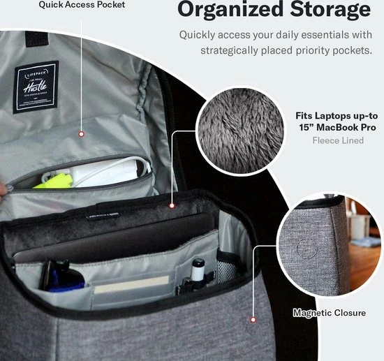 Of je nou vanuit huis werkt en of in een koffie shop, of dat je nou een lunched met iemand, maak je tas vast aan een object met onze gepatenteerde anti-diefstal slot en geniet van wat je ook doet wetende dat jouw rugzak veilig op zijn plek zal blijven staan.