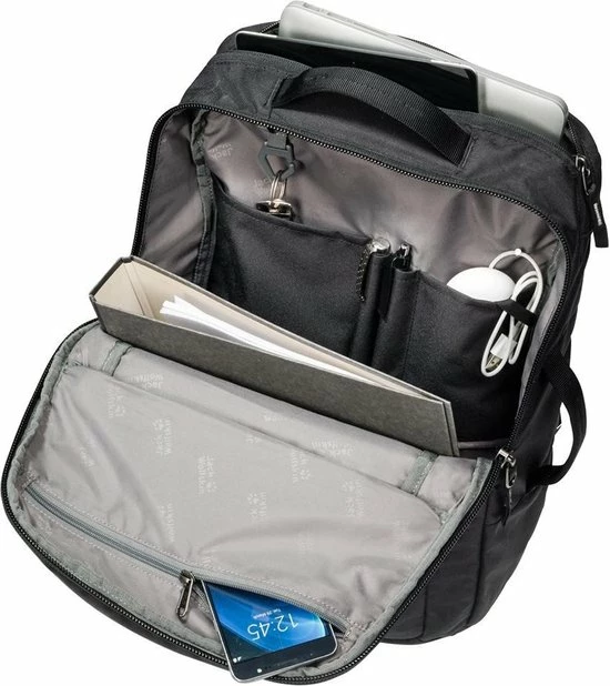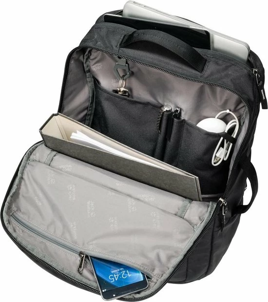 In het grote hoofdvak heb je voldoende plek voor boeken, papieren of ook voor je regenjack. In de geïntegreerde organizer met gevoerde binnenzak berg je je mobiele telefoon, bril en dergelijke op – en beschermt ze effectief tegen krassen. Om ervoor te zorgen dat ook je notebook (15″) en tablet (10″) optimaal beschermd zijn, bevindt zich hiervoor een apart vak direct op de rug.