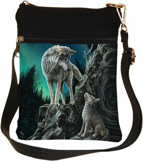 Guidance Shoulder Bag 23cm. Prachtige compacte schoudertas met mooie print van twee wolven bij het Noorderlicht. Het ontwerp is van fantasy artieste Lisa Parker.