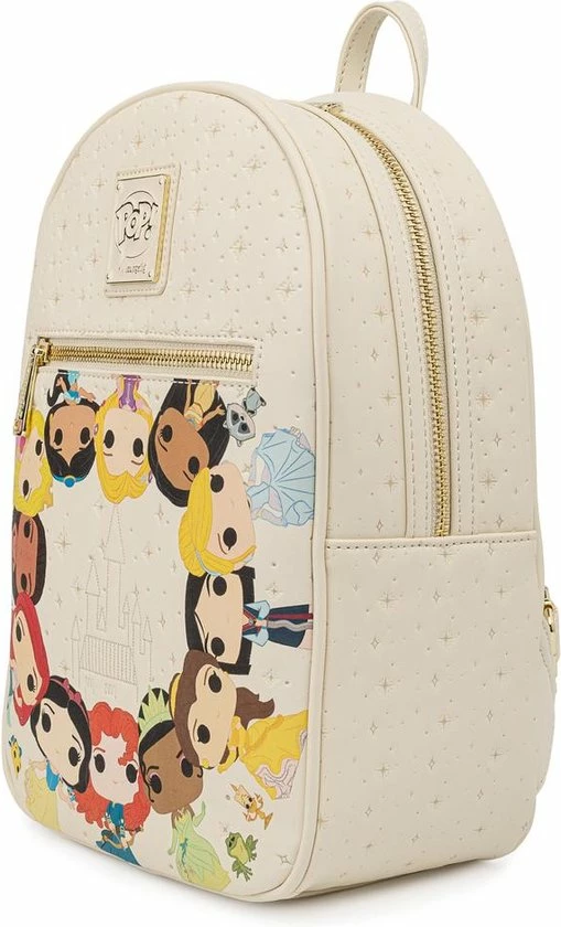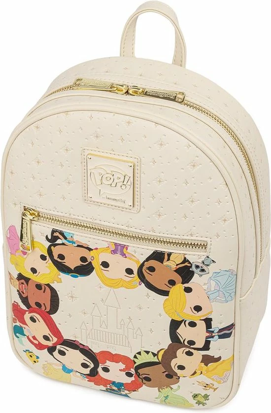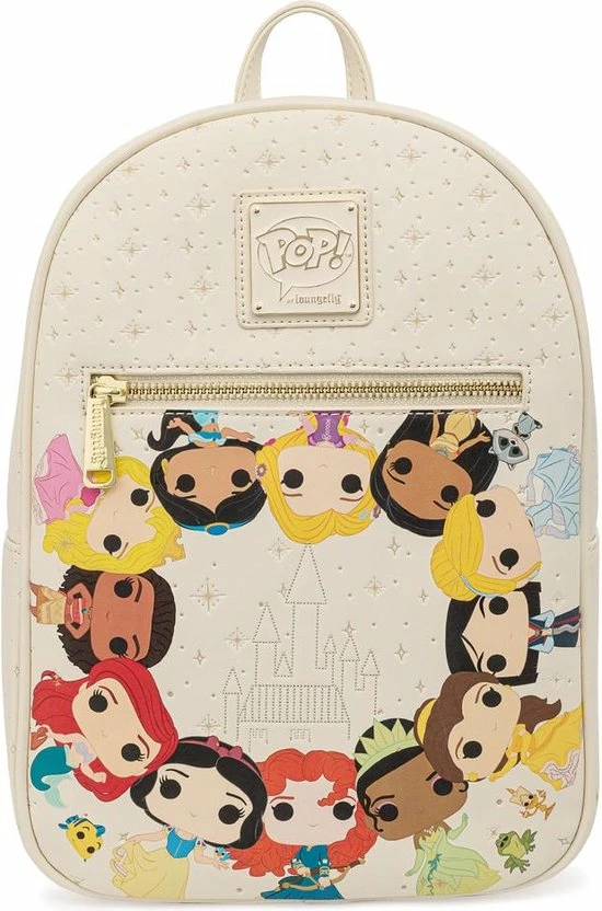 Rugtas Princess Circles Funko Pop. Geweldige kunstlederen tas uit de Disney-collectie van het Amerikaanse designermerk Loungefly. De rugtas is voorzien van een print met de Disney prinsessen in Funko Pop-stijl. Belle, Aurora, Moana, Jasmine, Merida, Cinderella, Sneeuwwitje, Pocahontas, Ariel en Tiana… ze zijn er allemaal! Het voorvak heeft een ritssluiting. De tas is voorzien van een ritsvakje aan de binnenzijde. Verder heeft de tas twee verstelbare schouderbanden en een bijpassende binnenvoering.
