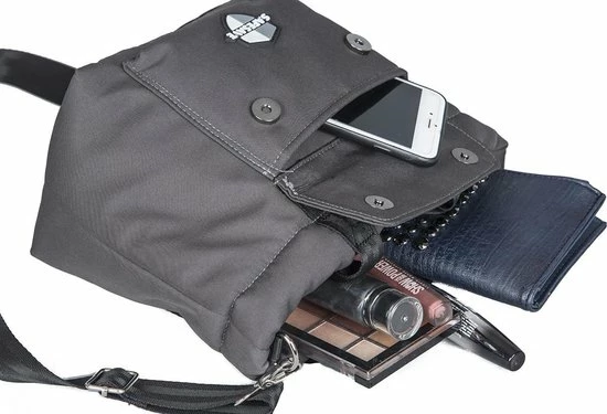 Deze schoudertas biedt twee opbergvakken die afsluitbaar zijn met een rits. Het is een degelijke tas met meerdere vakken en de band is lang genoeg om de tas ook diagonaal over de schouder te dragen. Het handige voorvakje met rits biedt voldoende ruimte aan sleutels, telefoon of andere persoonlijke spullen.