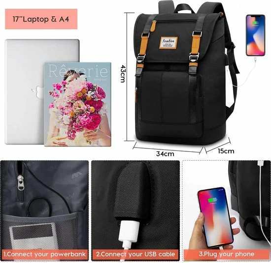 - USB-oplaadpoort en laptopcompartiment: als chique laptoprugzak met de geïntegreerde USB-poort kunt u uw eigen powerbank erin aansluiten en uw smartphone eenvoudig opladen. Het laptopvak is speciaal ontworpen voor je 17 inch, 15,6 inch, 15 inch, 14 inch en 13 inch Macbook, laptop of notebook en het aparte 9,7 inch tabletvak voor je iPad of tablet.