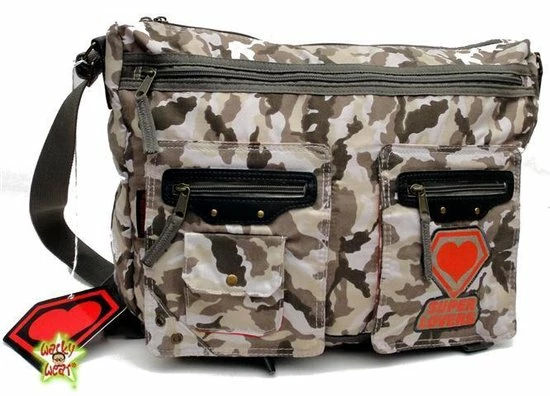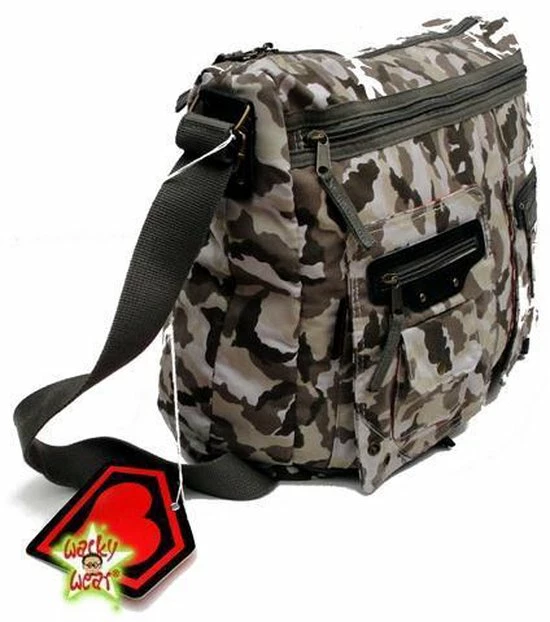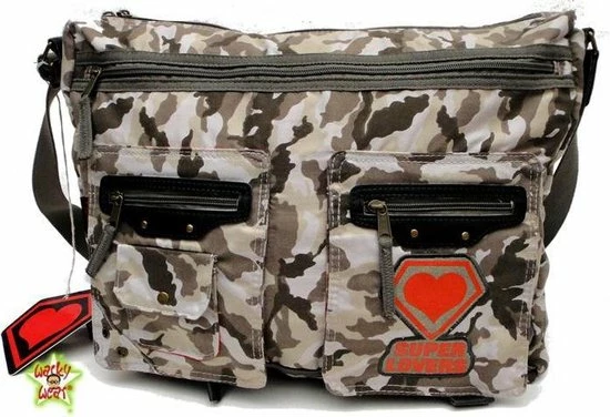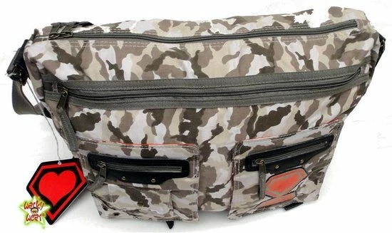 Grote canvas schoudertas van Super Lovers in grijze camo kleuren met veel vakken, perfect voor school of werk! A4 past makkelijk!