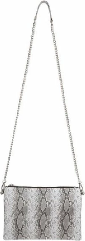 Een Musthave, deze trendy zeer gemakkelijke tas! Deze tas is heel gemakkelijk in gebruik dankzij de meegeleverde afneembare schouderband en afneembare polsband. Mooie lichtgrijze, donkergrijze en witte tinten wisselen elkaar af in het slangenmotief van deze gebruiksvriendelijke tas. De tas heeft een zilverkleurige rits. Aan de binnenkant een gevoerd ruim vak en een apart ritsvakje. De meegeleverde polsband is uitgevoerd in dezelfde slangenprint passend bij de tas. En de meegeleverde schouderband valt op door de lange zilverkleurige ketting. Aan de bovenkant van deze ketting is een schouderbandje gemaakt eveneens met een slangenmotief.